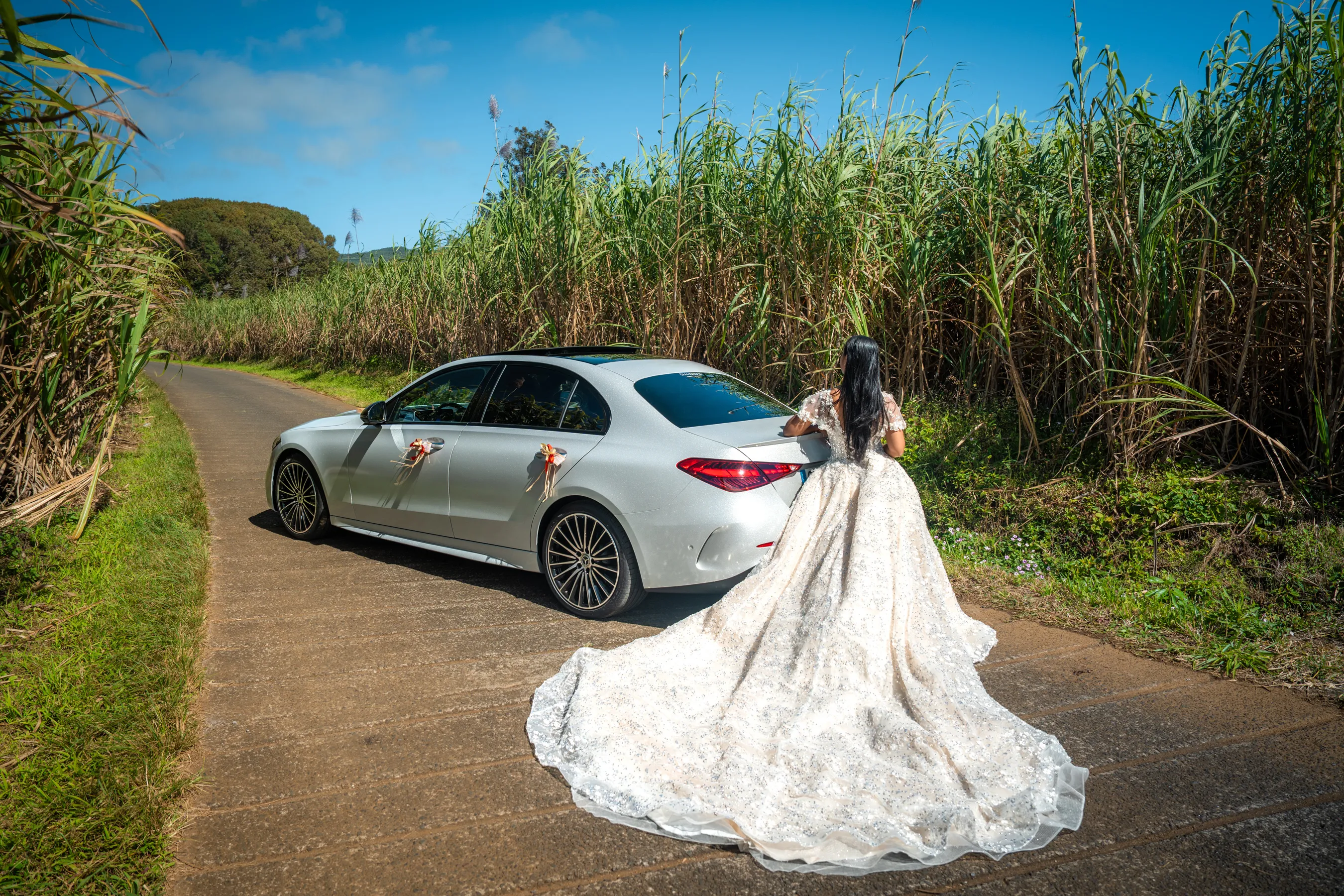 Que votre cérémonie ait lieu en bord de mer, dans les hauts ou dans un lieu de réception prestigieux à La Réunion, la voiture s’intègre parfaitement à l’ambiance et au style de votre mariage.